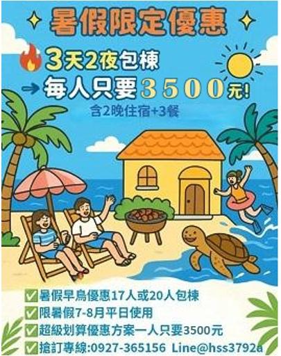 *本優惠活動僅限暑假平日包棟房使用,暑假平假日每*人需補800元。